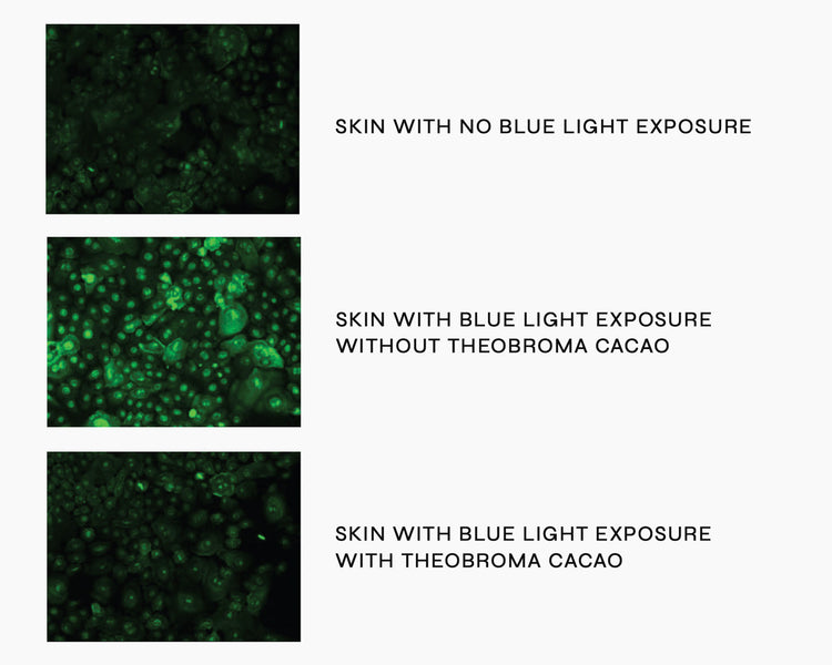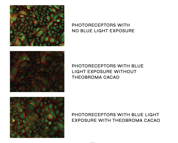 Cell images comparing how skin photoreceptors respond to blue light—with and without Theobroma Cacao.