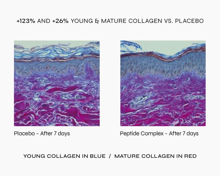 The peptide-treated skin shows a significant increase: +123% more young collagen, +26% more mature collagen vs. placebo.