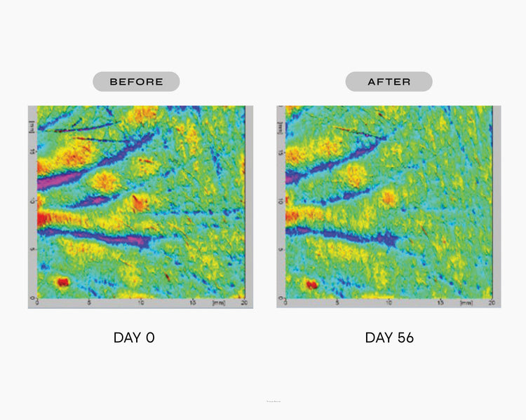 3D skin surface scans taken before and after 8 weeks of using a Theobroma cacao-based formula, twice daily.